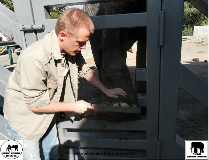 Foot-care with the African elephant-cow "Mirry" at Zoo Osnabrück. Foto: J. J. Long.
