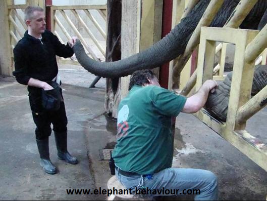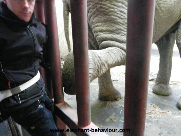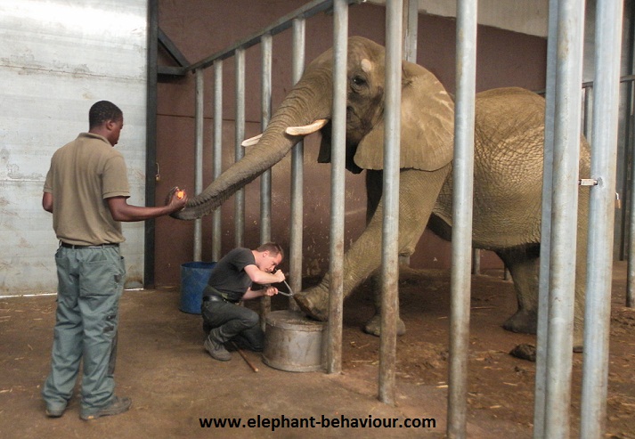 Foot-care by the African elephant-cow "Kariba" in Olmense Zoo, B. Left: James Kgwedi;