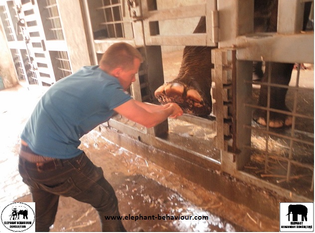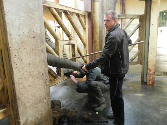Foot-care by the African elephant-cow "Kariba" in Olmense Zoo, B. Left: James Kgwedi;