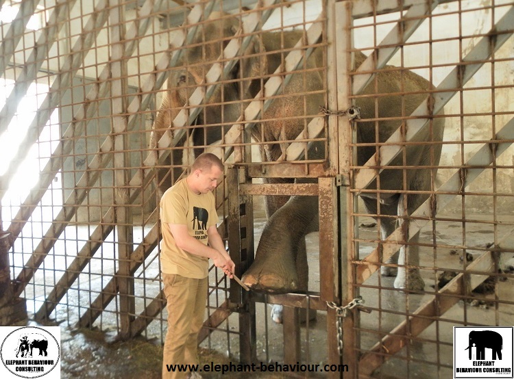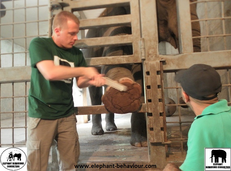 Training with the Asian Elephants. The training included: Target-Training and foot-care training. And giving very helpful recommendations about elephant care.